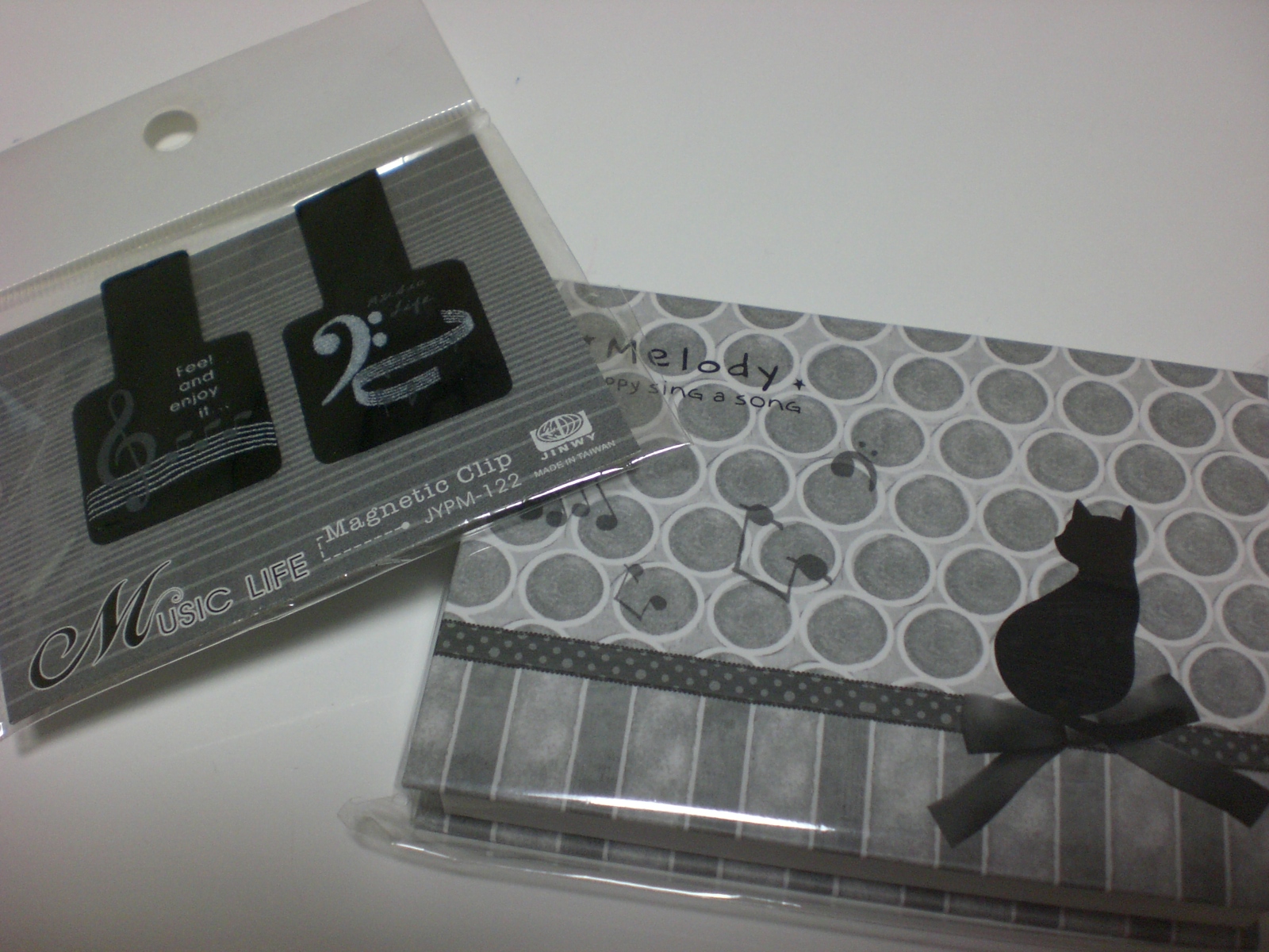 ブックマーク&メモ帳。ブックマークにはト音記号や裏側は楽器があしらってある。