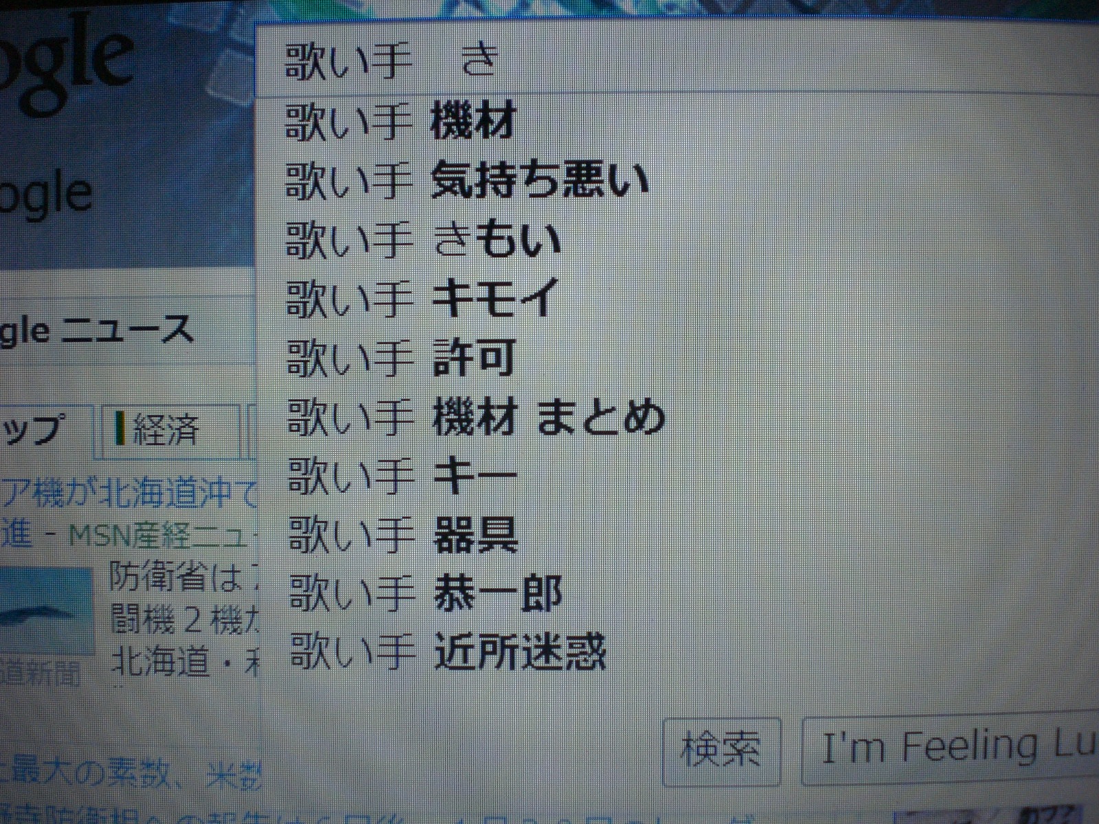 最初に予測されるのは「歌い手 機材」その次「歌い手 気持ち悪い」、「歌い手 きもい」てさ。「歌い手 近所迷惑」には吹いた。みんなこんなのになりたいのか。恥を末代まで伝えぬよう、早めに引退したら?若気の至りも年取ったら恥以外の何物でもないよ??