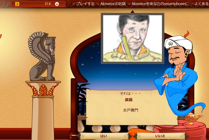 まず解説。何かキャラクターを思い浮かべる。いくつか質問に答えるとランプのおっさんがキャラを当ててくれるというもの。もともとは英語版だったが、日本語版もあったんだ。まぁ、無料だし意外と楽しいしつべこべいわずやれってんだ。