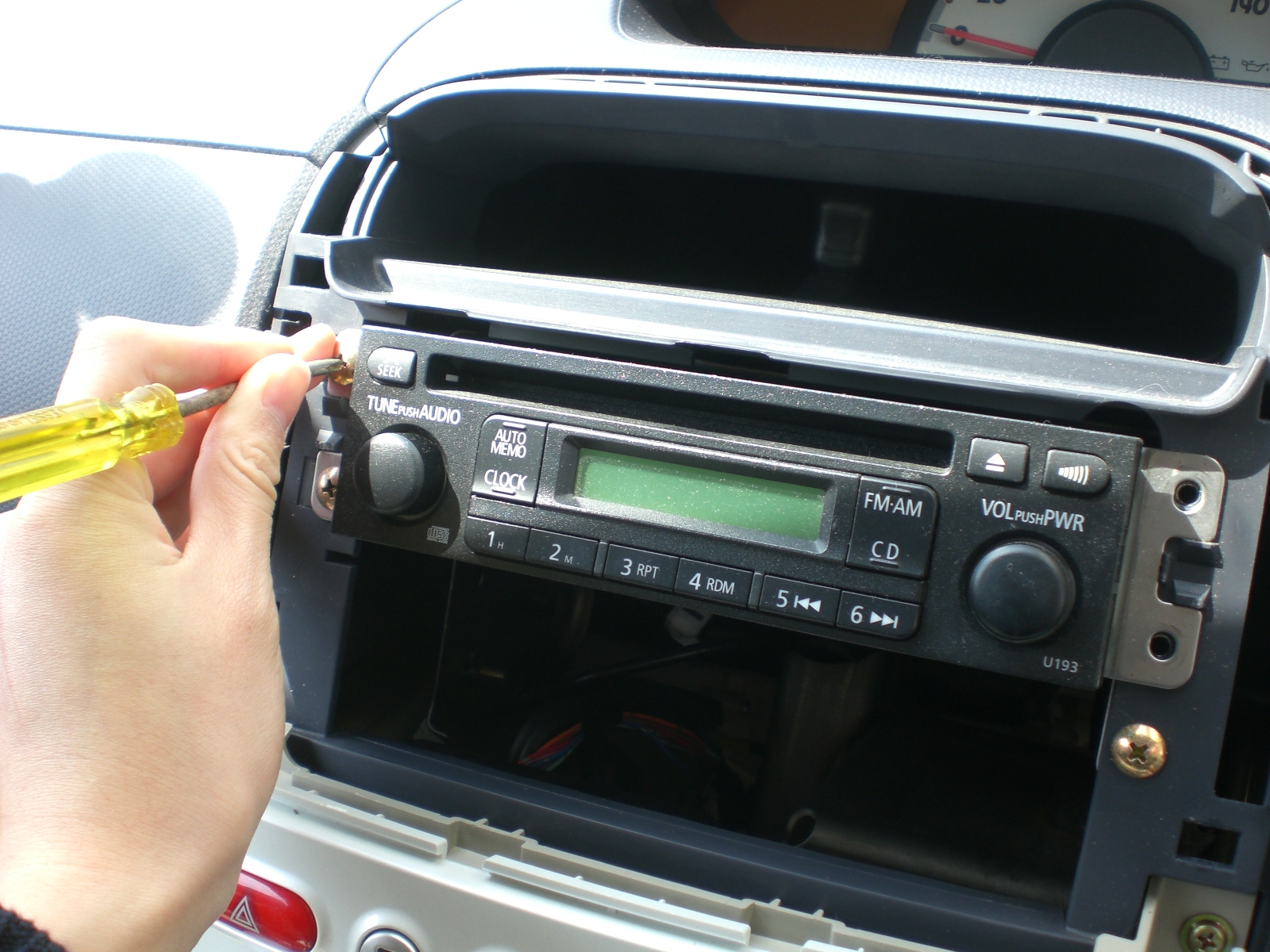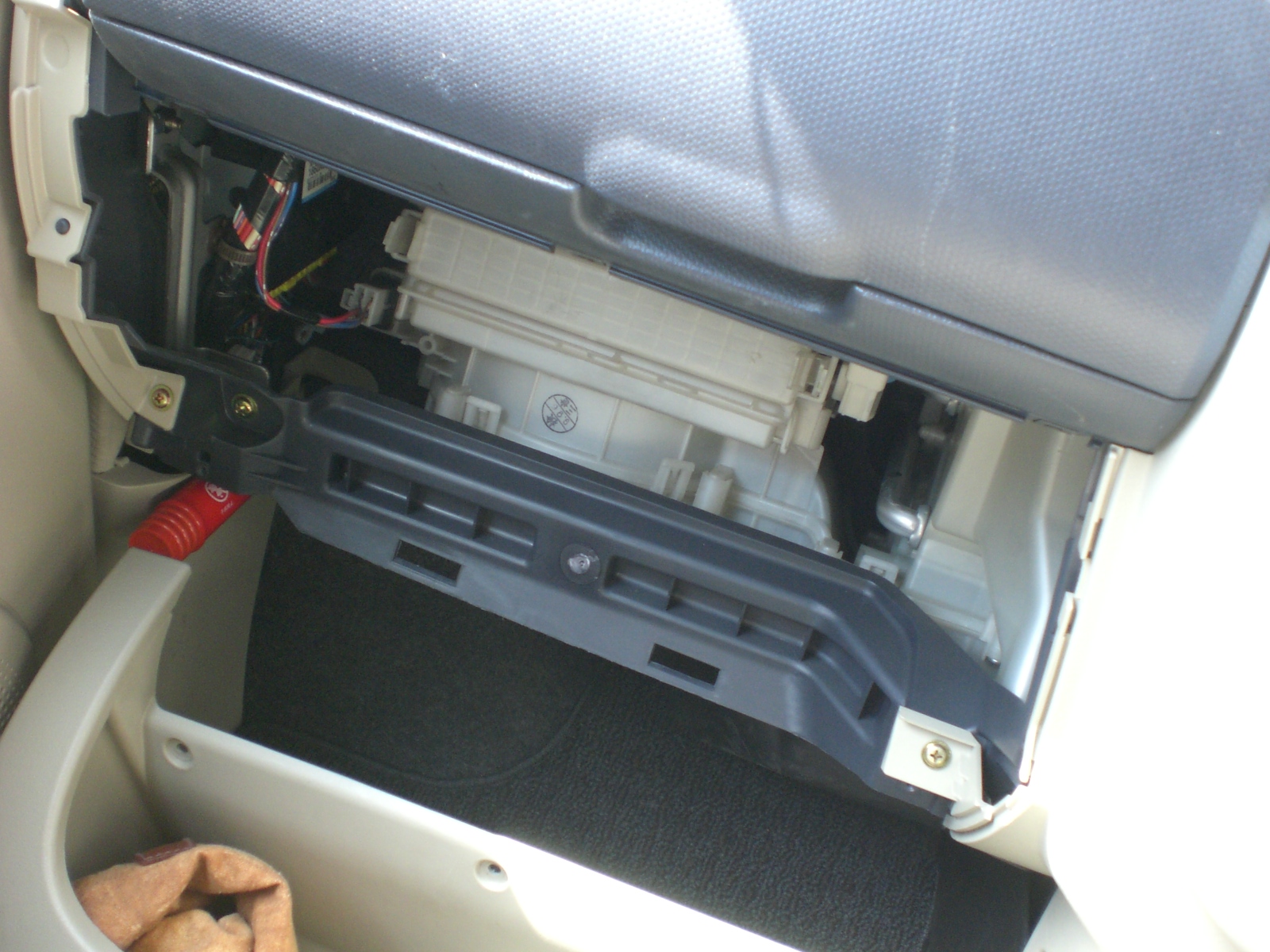 ここでカーナビのケーブルを中に収納したいので助手席側のボックスを開ける。これもネジ止め。