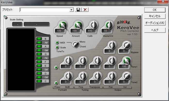 コチラはg200kgさんの「KeroVee」指定された音程以外ををカットすることでいわゆる「ケロ声」になる。つまりポルタメントが削られ、機械的ボイスに。これで俺も中田ヤスタカみたいに…なれないか。