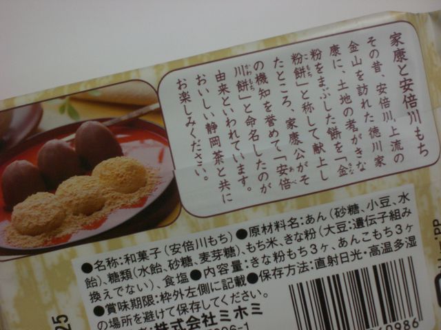 「家康と安倍川餅~その昔、安部川上流の金山を訪れた徳川家康に、土地の者がきな粉をまぶした餅を『金粉餅(きなこもち)』と称して献上したところ、家康公がその機知を誉めて『安倍川餅』と命名したのが由来といわれています。おいしい静岡茶と共にお楽しみください。」